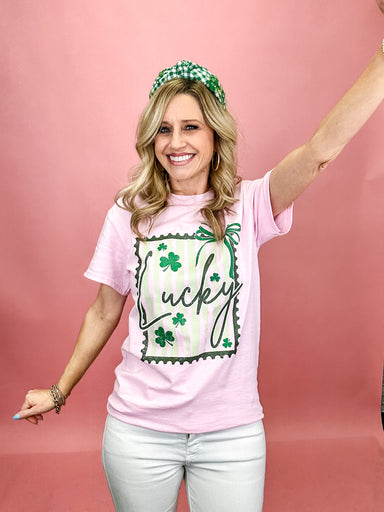 The Lucky Postage tee adds the perfect pop of fun to your everyday lineup. Featuring a green stripe postage-inspired detail with “lucky” across the...