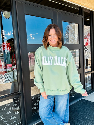 Cozy up in this oversized mock neck sweatshirt featuring "Dilly Dally" embroidered across the chest in crisp white lettering. The relaxed fit makes...