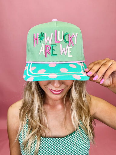The 'How Lucky' Embroidered Trucker Hat features a vibrant green design with a playful polka dot brim. The charming embroidered phrase “how lucky a...