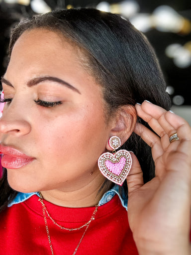 Hand-beaded heart-shaped earrings featuring delicate pink, white and gold beadwork. Perfect for everyday wear or special occasions, these lightweig...
