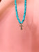 The Ava Turquoise Necklace features small turquoise beads and a delicate cross with a gemstone pendant. This stylish piece adds a touch of color and spirituality to any outfit, making it perfect for daily wear or special occasions.