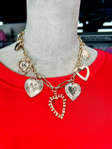 A statement piece with all the love. This necklace features a bold gold chain adorned with an eclectic mix of heart charms, each with its own uniqu...