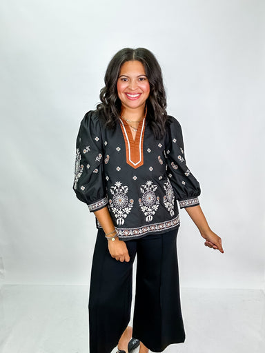 This black dress features 3/4 length sleeves adorned with olive and rust floral patterns. The cinched wrists add a gentle touch of shape and comfor...