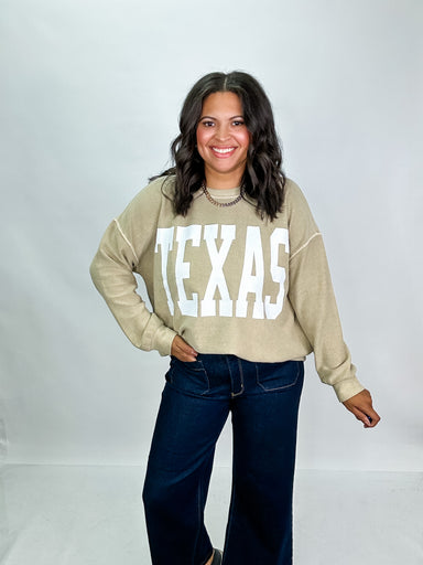 This mineral wash ribbed crewneck sweatshirt features a comfortable fit and a classic design with "TEXAS" printed in bold block letters across the ...
