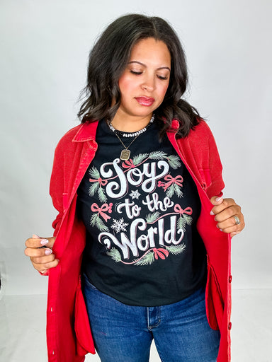 Celebrate the season in style with this classic black Christmas tee. Featuring "Joy to the World" in distressed lettering paired with festive poins...