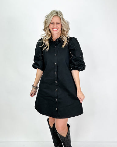 The Midnight Mineral Dress features a black mineral wash fabric with short sleeves and unique asymmetrical details for a modern look. This dress of...