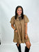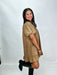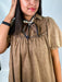 The Harvest Haze Dress features a soft brown chambray fabric with charming puff sleeves and a delicate ruffle hem. Its comfortable fit and feminine details make it perfect for everyday wear or casual outings.