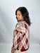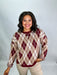 Wrap yourself in cozy comfort with this burgundy and tan argyle sweater. The soft knit fabric feels gentle against your skin, while the classic argyle pattern adds timeless style to any outfit. Perfect for layering on cooler days or wearing solo for an effortless, polished look. A wardrobe essential that pairs beautifully with jeans, skirts, or trousers.