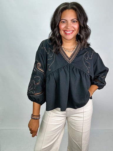 The Ember Babydoll Blouse features a black babydoll silhouette highlighted by brown embroidered details. Its balloon sleeves with cutouts add a pla...