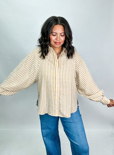 The Marigold Button Down features a chic khaki and cream striped pattern with a fitted body that flatters your silhouette. Its balloon oversized sl...