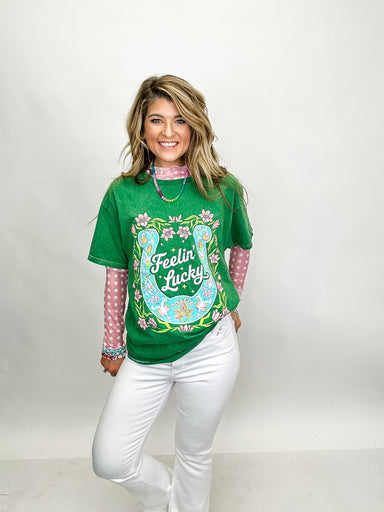 This green mineral wash tee brings all the vintage charm with a “feelin’ lucky” graphic and classic horseshoe detail. Soft, relaxed, and perfectly ...