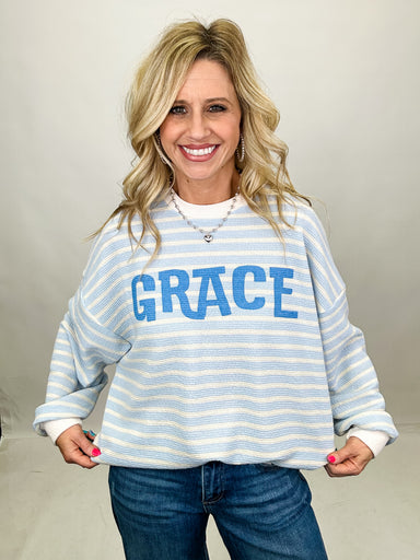 A lightweight blue striped pullover featuring “grace” across the front for a simple, meaningful touch. Soft, relaxed, and easy to style, it’s the p...