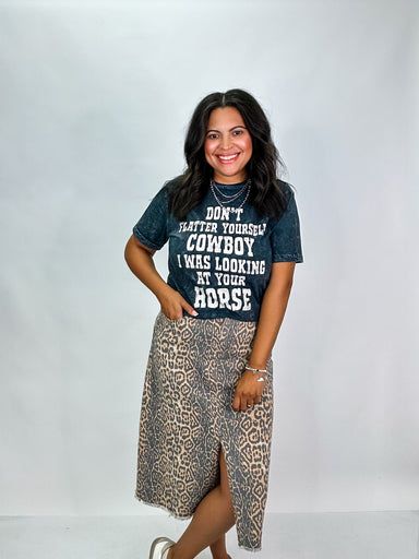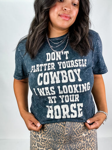 This black mineral wash tee brings the attitude with a perfectly worn-in, vintage feel. Featuring the cheeky phrase “don’t flatter yourself cowboy,...