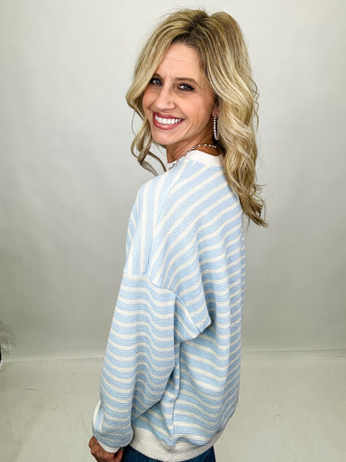 Discover effortless coastal style with the Seabreeze Striped Top. This breezy piece combines crisp blue stripes with solid contrast detailing at th...