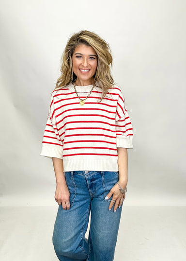A timeless cream knit with a modern touch, this striped sweater features flattering 3/4 sleeves and contrast stripes in red or black. Soft, comfort...