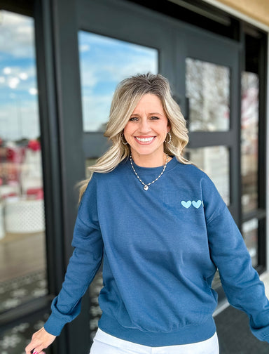 Cozy white sweatshirt with an uplifting message of faith. Features three small red hearts arranged on the front, with a bold larger red heart on th...