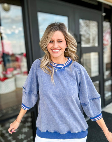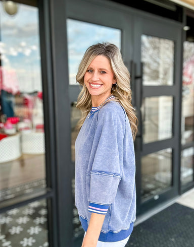 The Maya Mineral Wash Top features a relaxed rugby style with a soft mineral wash finish. Blue and pink contrast stripes accent the collar and slee...