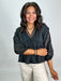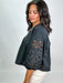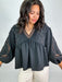 The Ember Babydoll Blouse features a black babydoll silhouette highlighted by brown embroidered details. Its balloon sleeves with cutouts add a playful touch, making it a comfortable and stylish choice for everyday wear.